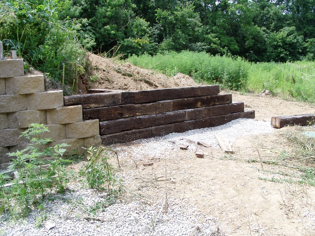 Monday night, Matt came out, and Adam came back, and we finished the second garage side retaining wall. There were some big pieces to move and get lifted up pretty high, and we dulled another chain when Adam hit rocks in a tie. It was hot and humid, and we were all dripping wet with sweat by the time we finished. But we got it finished, and no one actually collapsed.